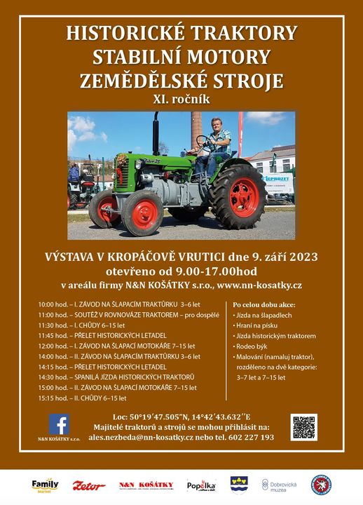 Výstava HISTORICKÉ TRAKTORY – STABILNÍ MOTORY – ZEMĚDĚLSKÉ STROJE se uskuteční v sobotu dne 9. 9. 2023. Tato výstava se koná již po jedenácté v areálu firmy N&N KOŠÁTKY s.r.o., Kropáčova Vrutice, od 9.00 – 17.00 hod.